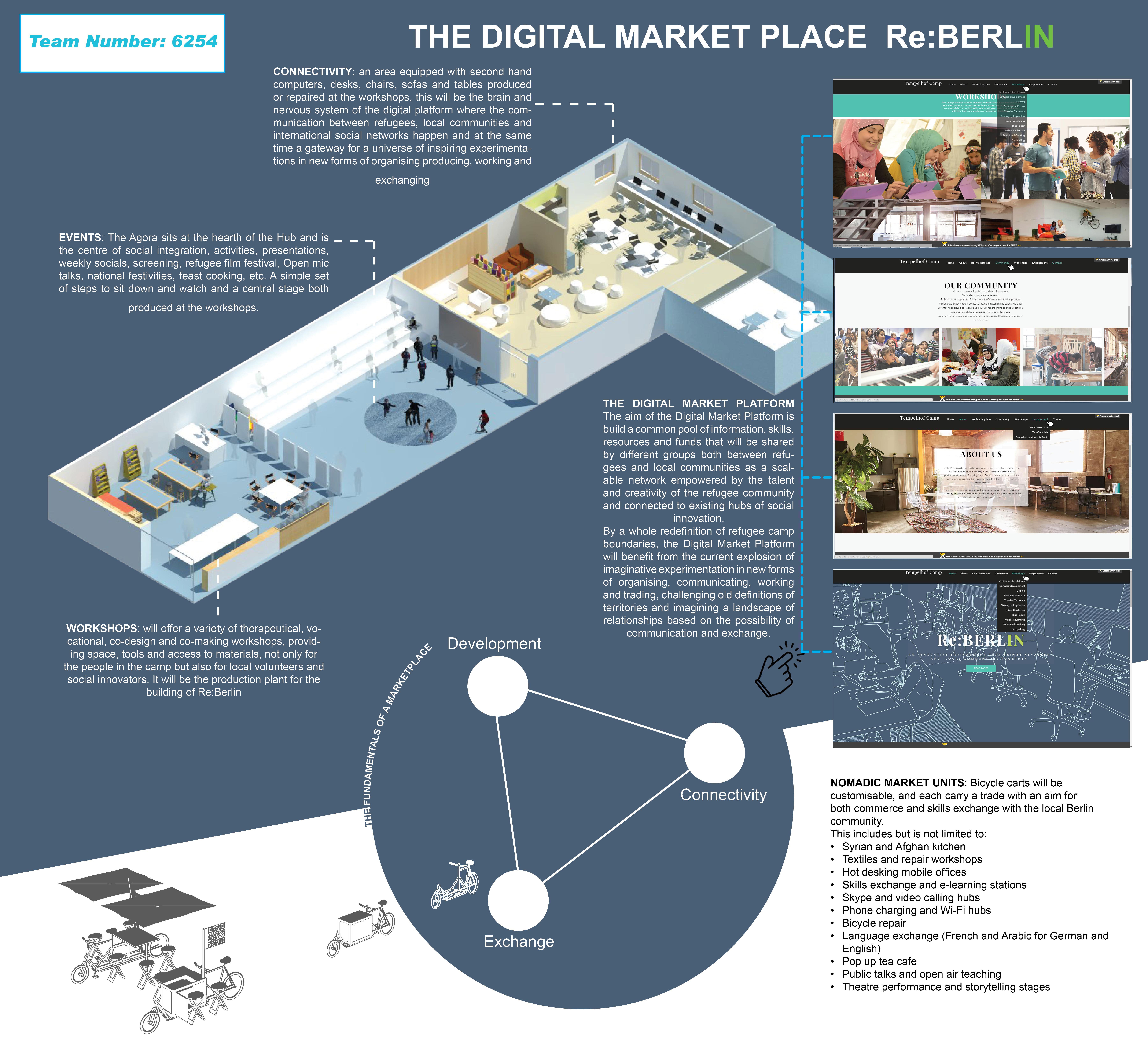 The framework begins by identifying the three fundamental elements necessary for markets to thrive: Development, Connectivity and Exchange. Our proposal addressed these in the form of: The Hub, The Digital Platform and The Nomadic Market Unit. We believe that this multi-platform approach is necessary for the success of any economic intervention for the refugees.